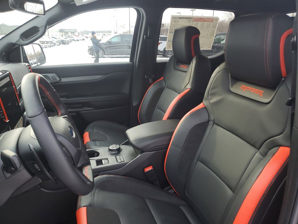 Inside, the cabin blends rugged capability with modern refinement. A digital instrument cluster, large center touchscreen with SYNC connectivity, heated Raptor-exclusive seating, ambient lighting, and advanced driver-assist technologies create a cockpit that feels just as comfortable on long highway drives as it does when the trail gets rough.